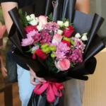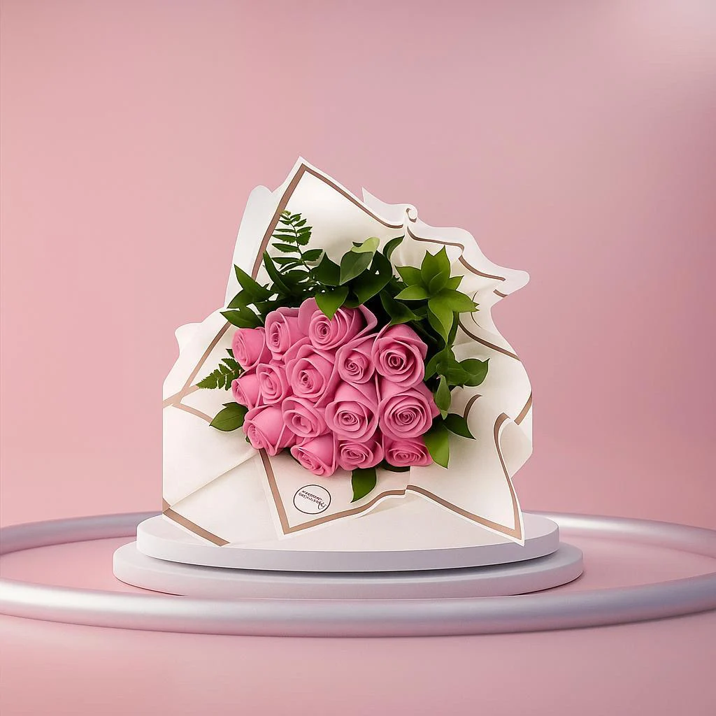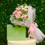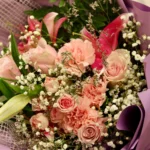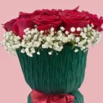 • باقة الورد: باقة فخمة من ورود البيبي روز الوردية الفاتحة، ملفوفة بأناقة باللون الأبيض ومزينة بأوراق الأوكالبتوس الخضراء. (رمز للرقة والجمال!)