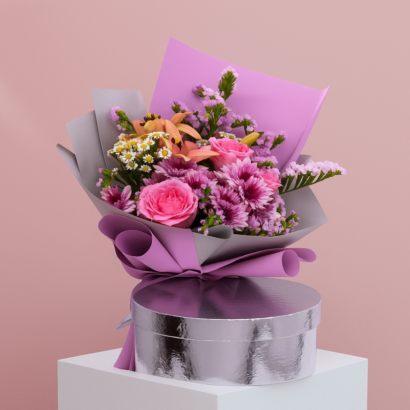 ألوان متألقة – باقة ورد فخمة وردية وزنابق كازابلانكا مع غلاف فضي