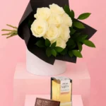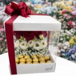 مزيج من الوان الورد الأبيض وبراعم الورد مع شوكلاته باتشي او فيريرو او البستاني او أنوش