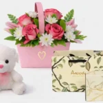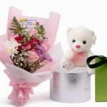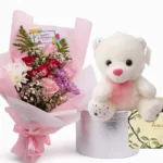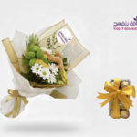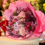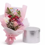 باقة الحب الأبدي – باقة ورد طبيعي مع ورد وردي وأقحوان أبيض مع كيكة أني داني الصغيرة