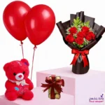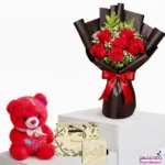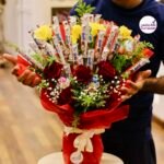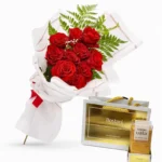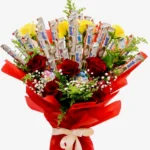 باقة جوري أحمر مع بوكيه شوكولاتة كيندر