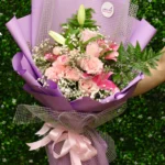 تتميز هذه الباقة الأسرة بمزيج رائع من الورود الوردية الناعمة والزنابق الأنيقة والأقحوان الرقيقة. يخلق المزيج الجميل للألوان والملمس ترتيبا