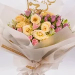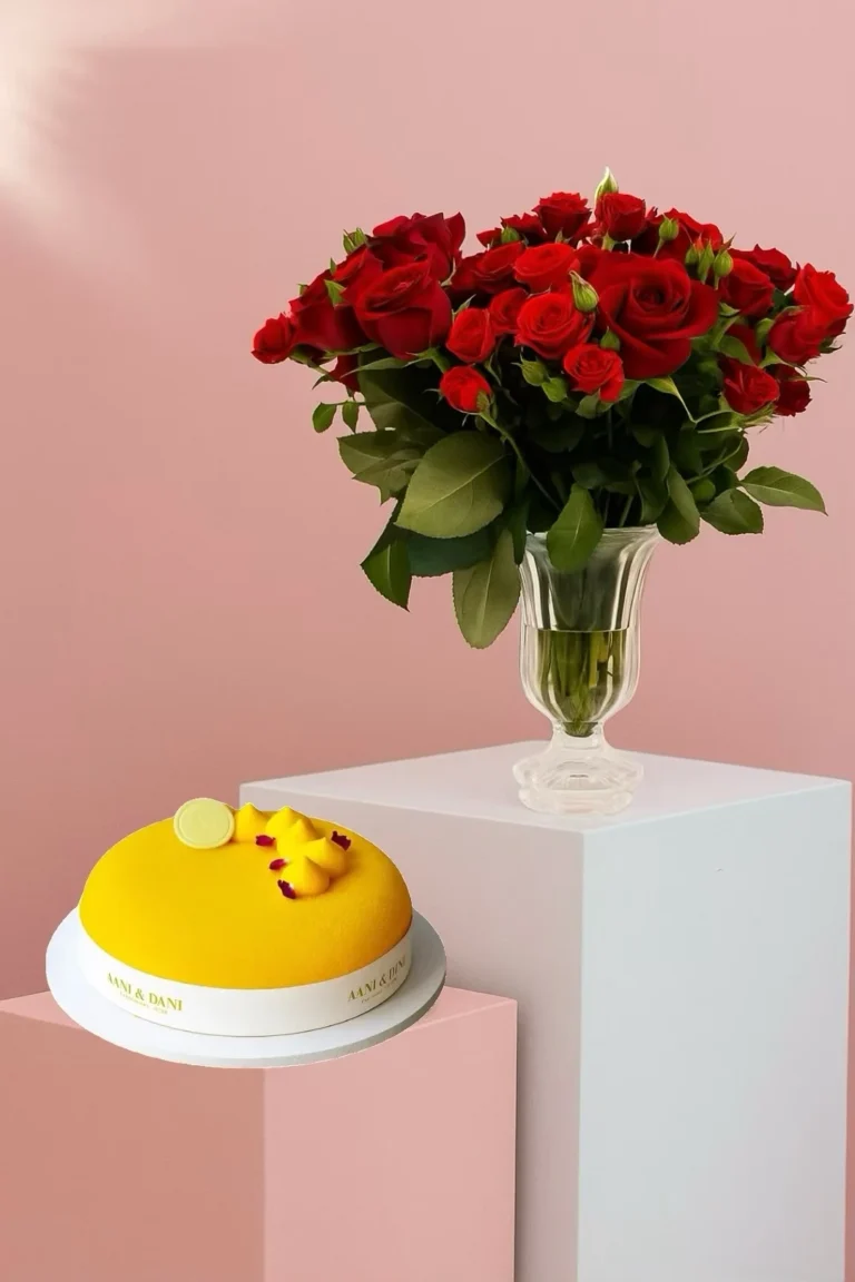 باقة بيبي ورد أصفر ووردي مع كيكة أني داني صغيرة