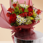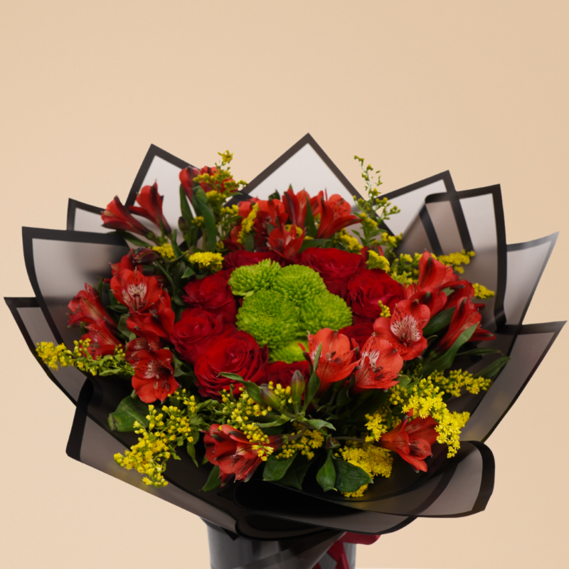• باقة ورد جوري فاخرة: ورود حمراء نضرة مغلفة باللون الأسود الملكي لتعبر عن الرقي والاهتمام.