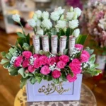 جمال وردي – باقة ورد وردي مع زنابق وأقحوان أنيقة مع الكيك اروى الصغيرة