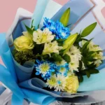 باقة ورد أبيض وأقحوان بتغليف أزرق باقة فقط