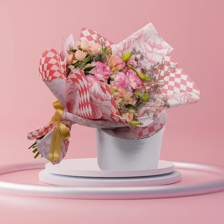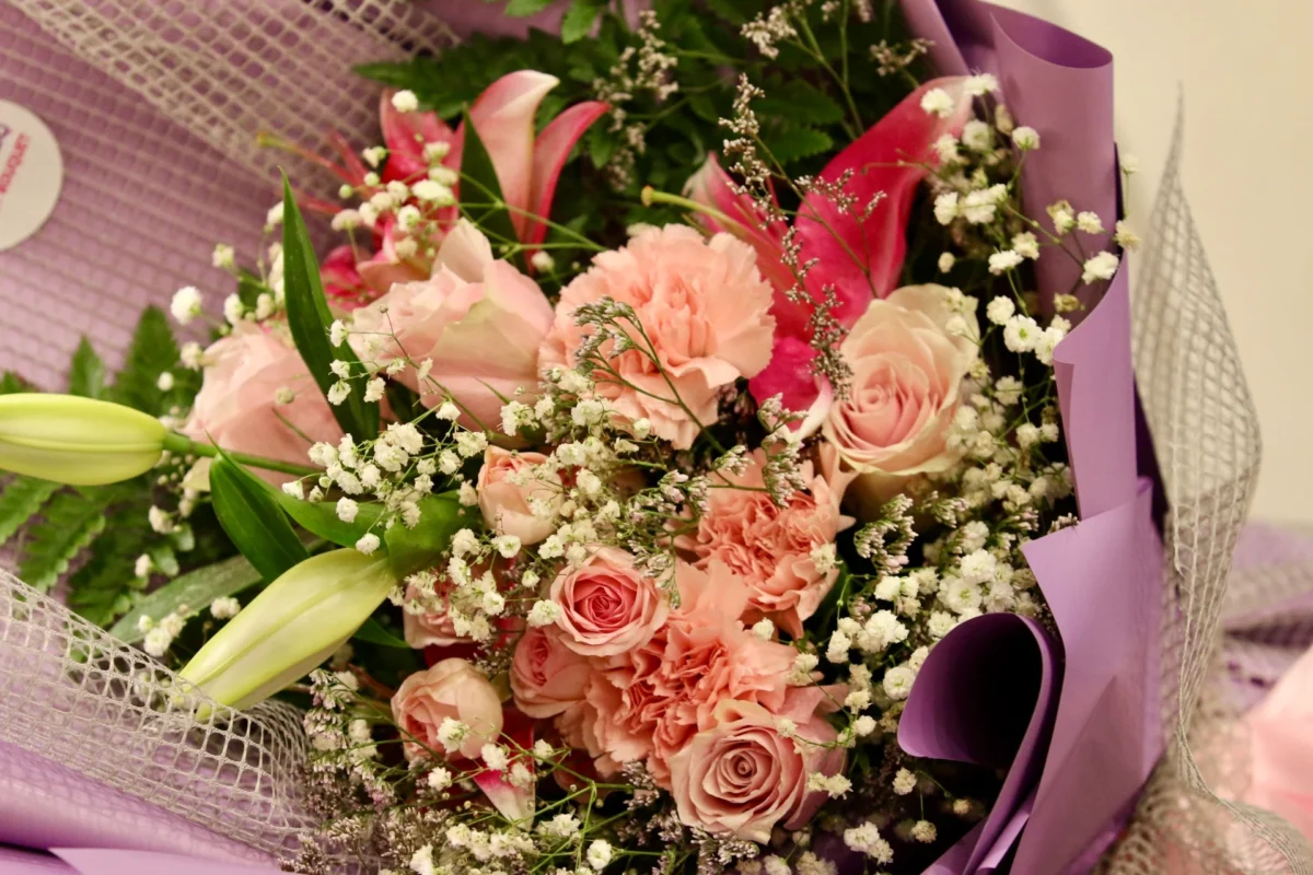 بسمة مشرقة – باقة ورد وردية بلمسات ليمونيوم وليليوم ناعمة