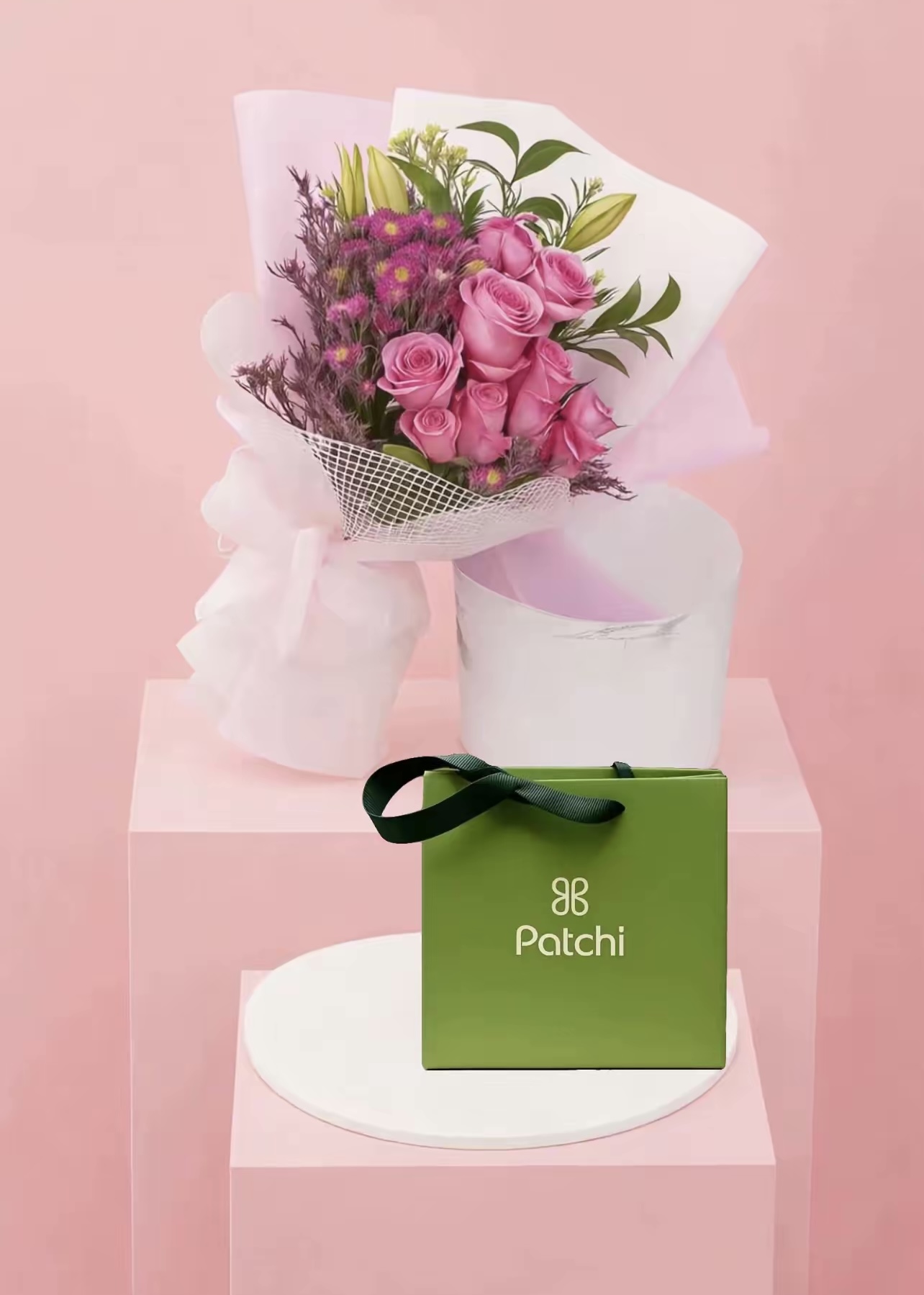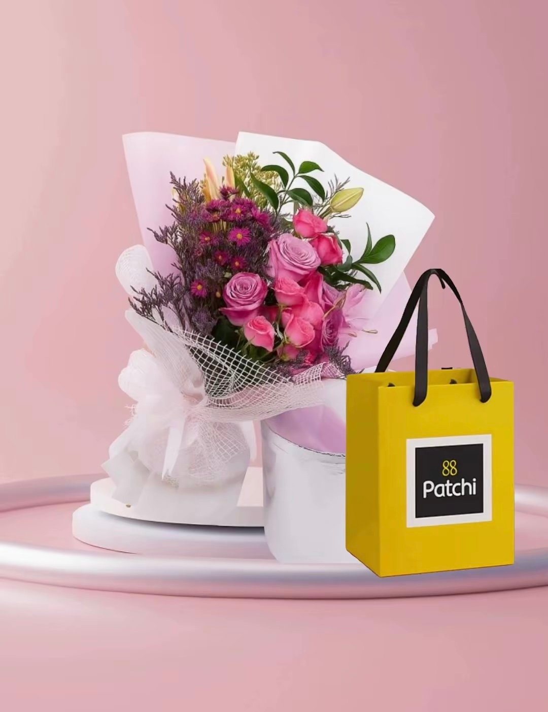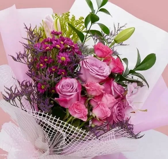 باقة ورد وردي رقيقة: باقة مصممة بعناية فائقة من الورود الوردية التي ترمز للرومانسية، مصحوبة بلمسات من الزهور الأرجوانية لتضيف عمقًا وسحرًا.