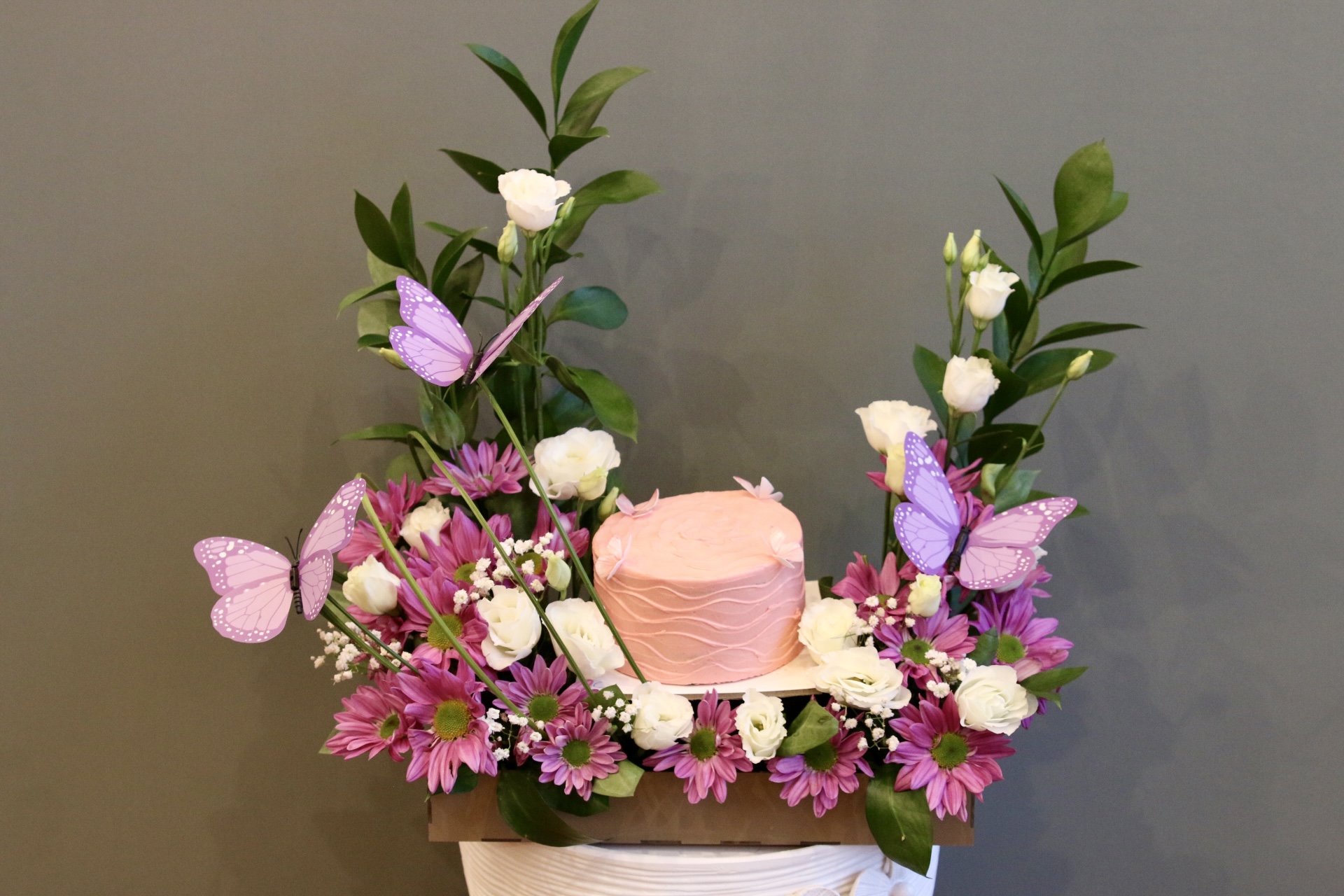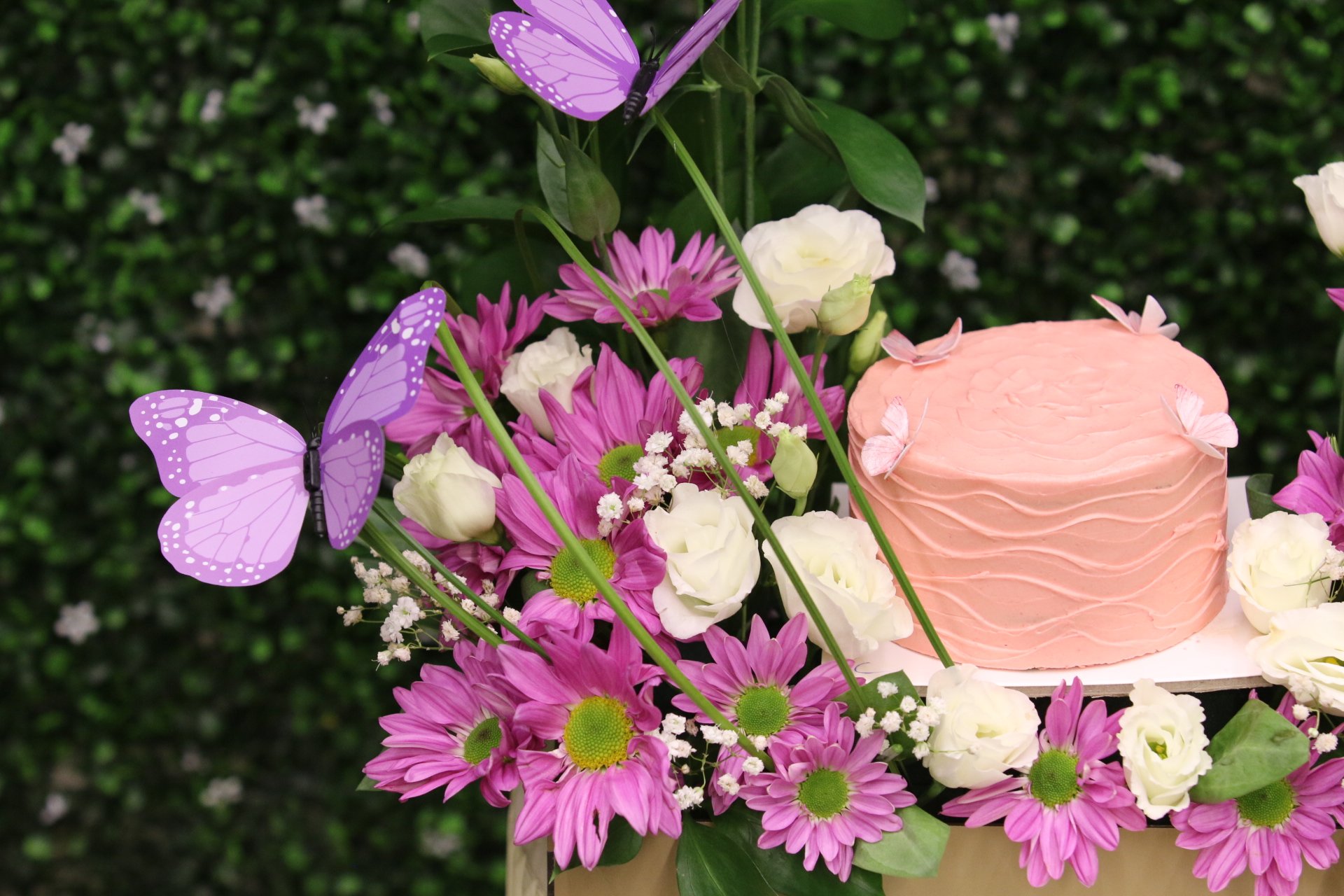 نقدم لكم "تنسيق واحة الفراشات الحلوة"، تحفة فنية تجمع بين الرقي والاحتفال! تصميم ساحر يضم كيكة صغيرة ، محاطة بأجمل الزهور الطبيعية ، وتزدان بفراشات الأناقة.