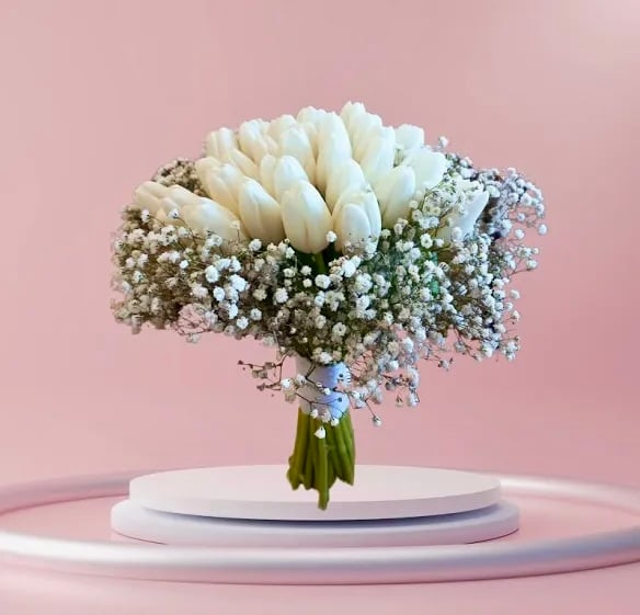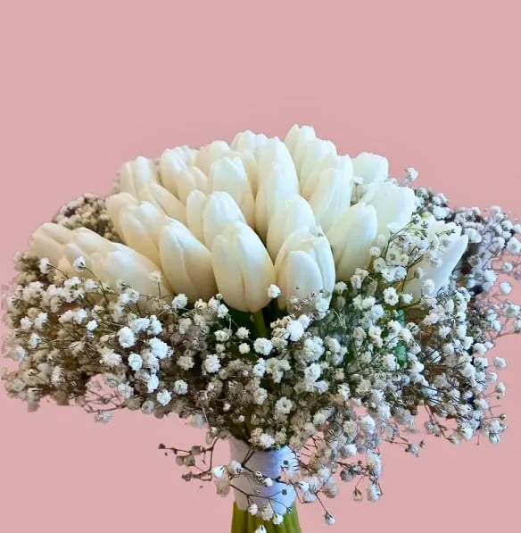 تألقي في يومك المميز مع مسكة عروس أنيقة تجمع بين الورد التوليب الناعم وزهور الجيبسوفيلا الرقيقة.