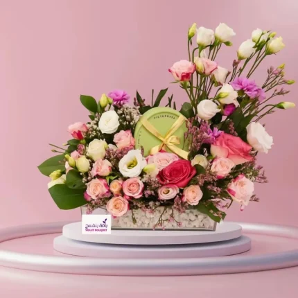 أهدي من تحب لحظة جمال لا تُنسى مع تنسيق ورود أنيق يجمع بين الورد الأحمر الجوري، الزهور البيضاء والوردية، ولمسات خضراء طبيعية تزيده روعة.مثالي للهدايا، المناسبات، أو لتزيين منزلك بلمسة من الفخامة.