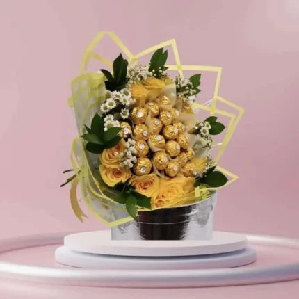 ابتسامة مشرقة – باقة ورد صفراء مع شوكولاتة فيريرو روشيه 24 قطعة