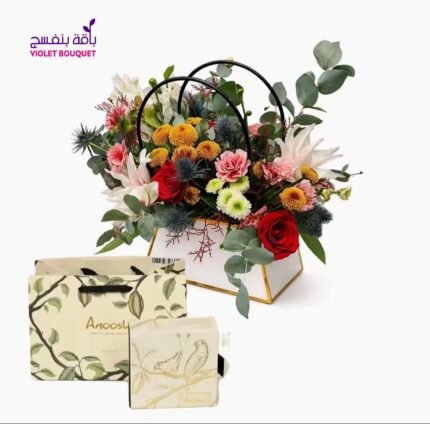 باقة ألوان زاهية سلة أزهار متنوعة مع شوكلاتة أنوش الفاخرة