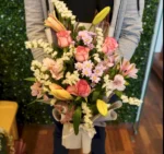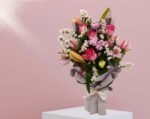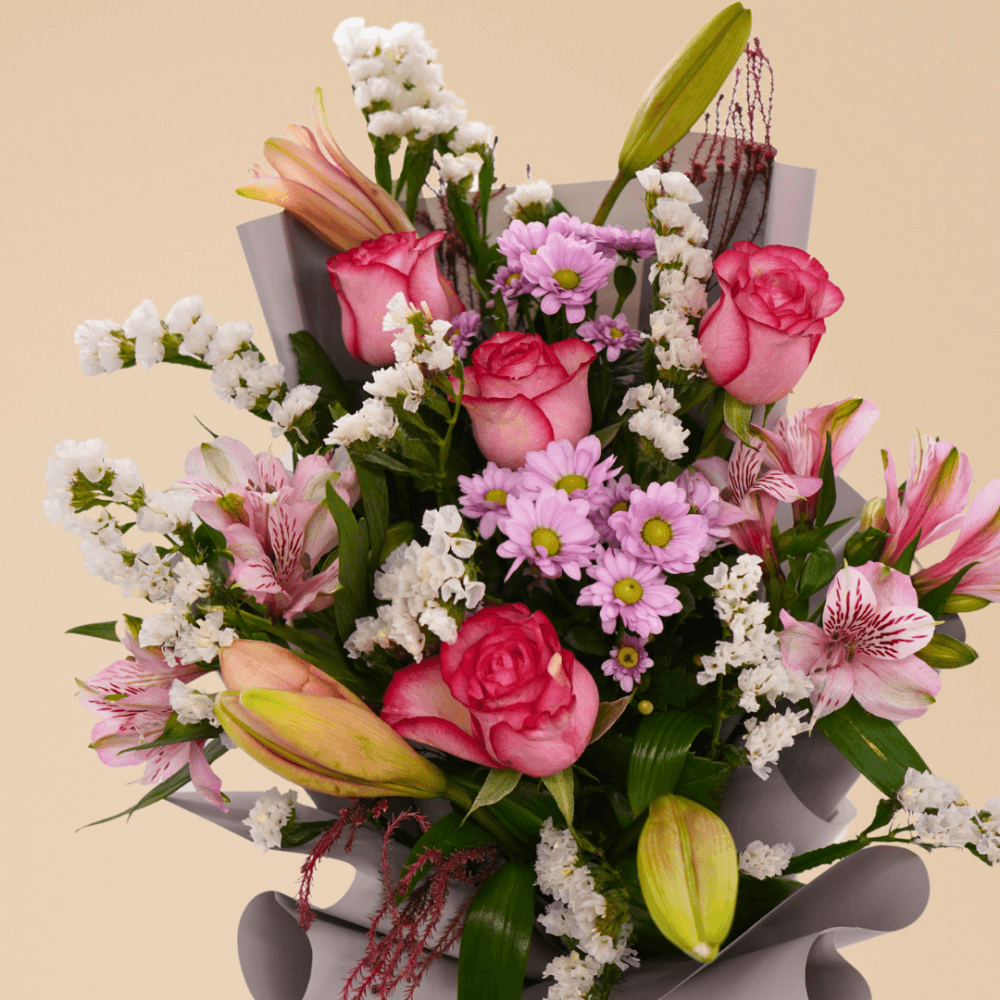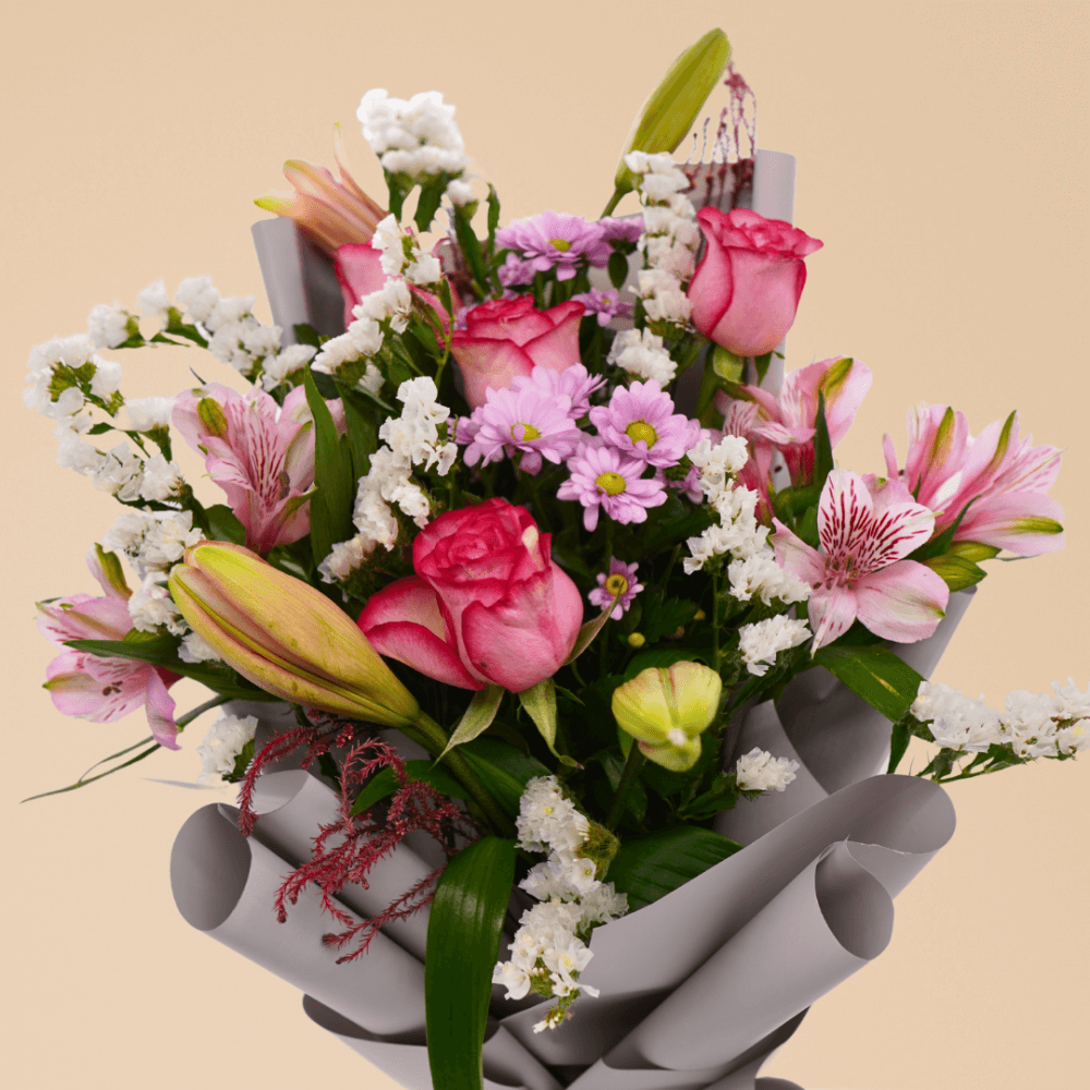 تجمع هذه الباقة الأنيقة بين الجمال الخالد ولمسة من الغرابة. تخلق الورود الوردية الكلاسيكية وزنابق كازابلانكا قاعدة راقية، بينما تضيف الأستريوميا المرحة والأقحوان انفجارًا من الألوان. مع لمسة من ستاتيس لإضفاء لمسة من القوام، إنها اختيار ساحر لا يُنسى.