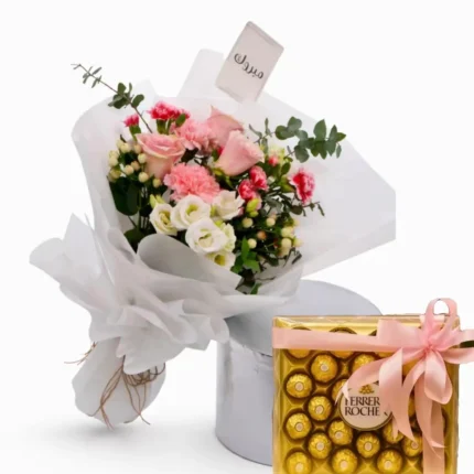 تفاصيل المنتجيبرز الغلاف الأبيض جمال الورود والقرنفل والهايبركوم. مع لمسات من أوكالبتوس صغير وإستوما وركوس وشوكلاتة فيريرو او باتشي او البستاني او أنوش الفاخرة
