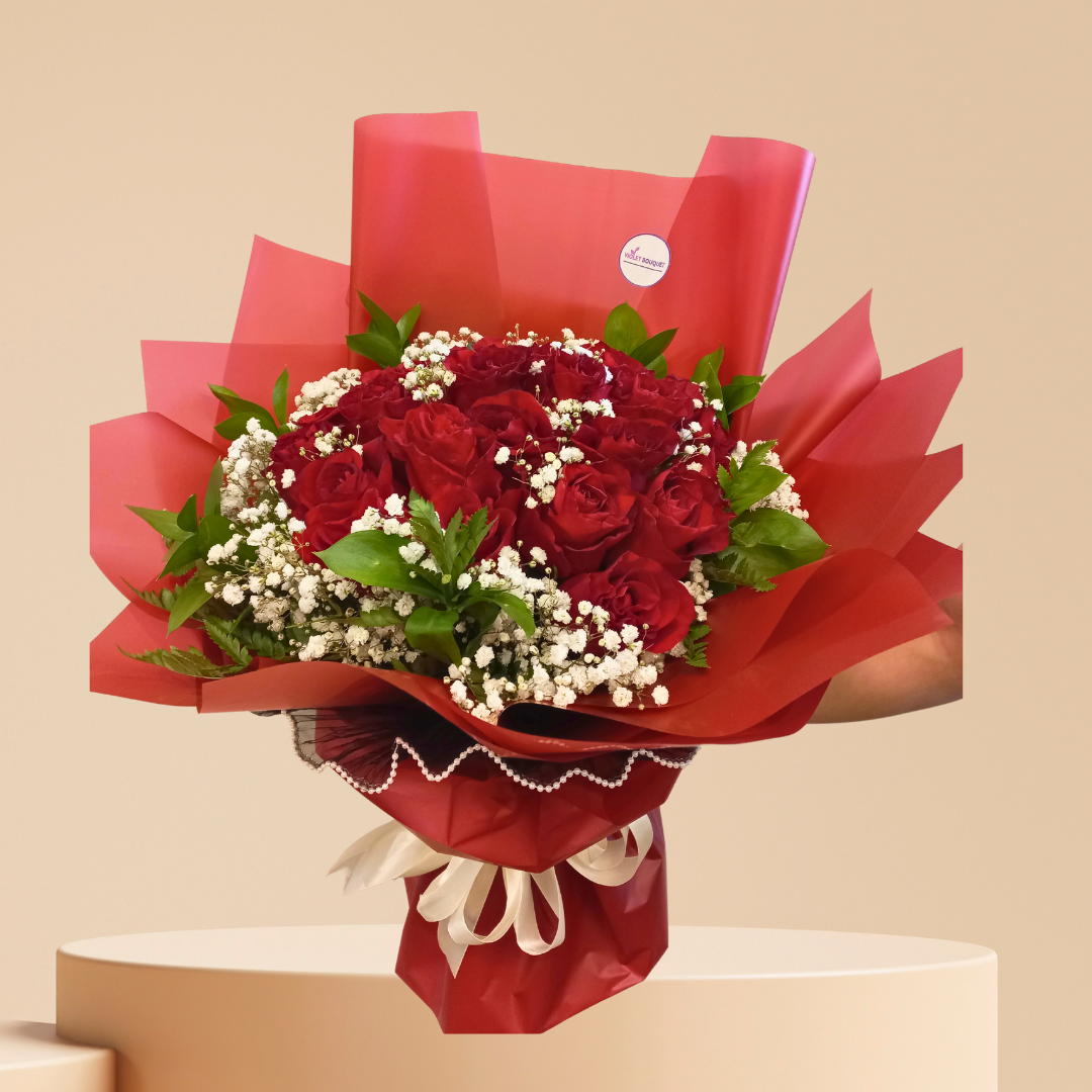 باقة شغف أحمر في نقاء أبيض – بوكيه ورد أحمر فاخر للهدايا