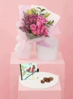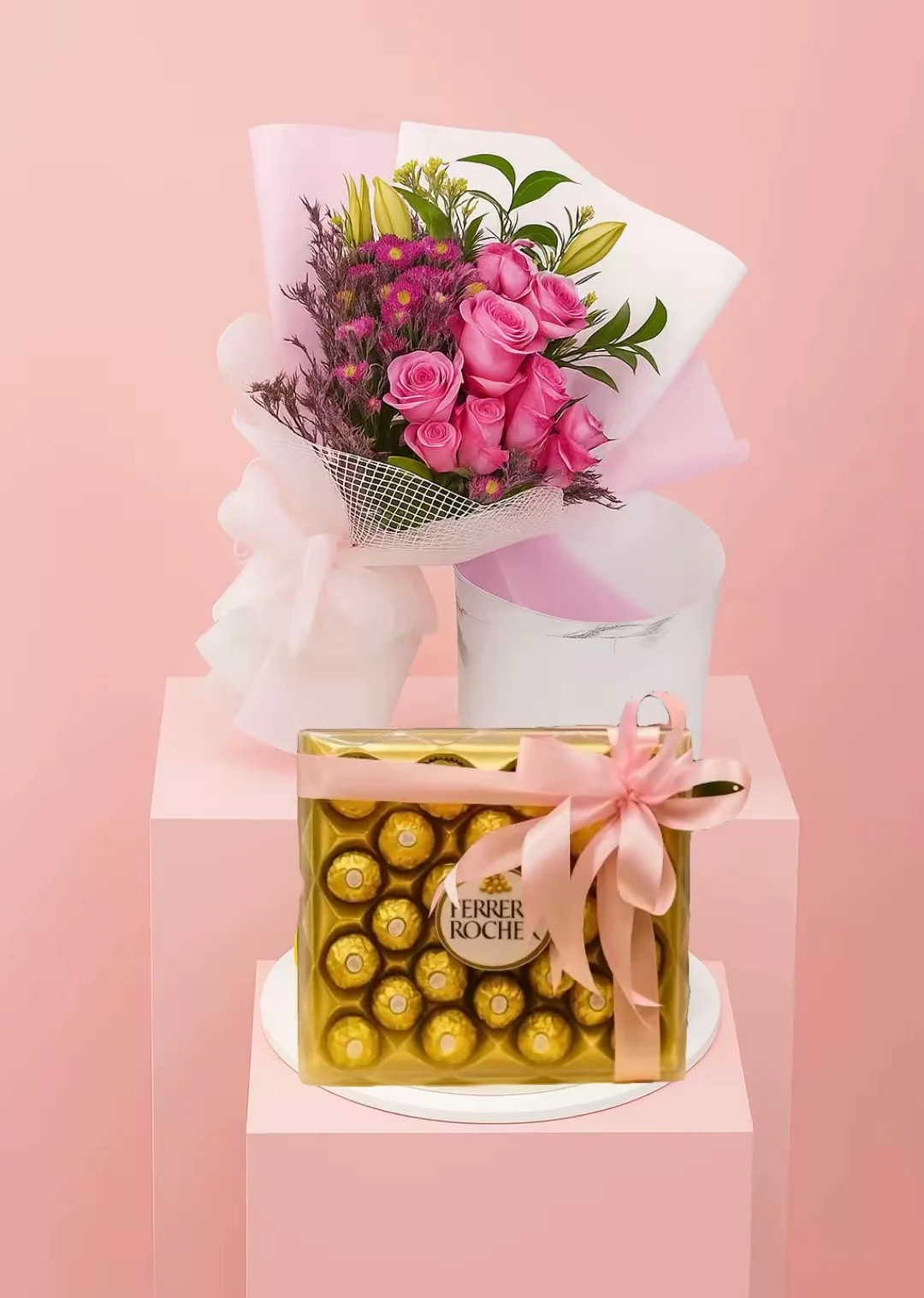 اهدي من تحب هده الباقة الرقيقة من بيبي روز وردية مصحوبة بشوكولاتة فيريرو او باتشي