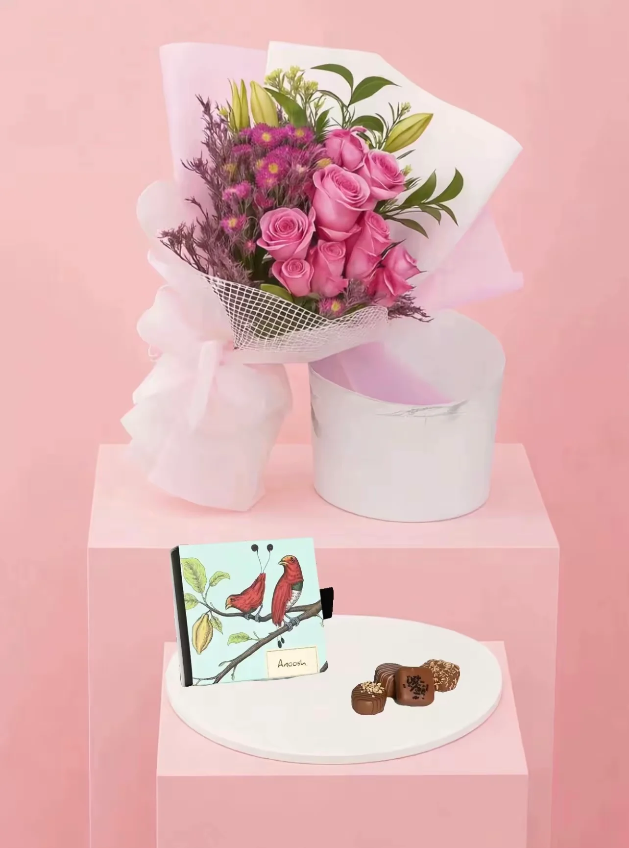 الهدية التي لا تُخطئورد وشوكولاتة. مزيج كلاسيكي يرضي كل الأذواق. باقة ورد أنيقة مع صندوق فيريرو روشيه الذهبي او شوكلاتة باتشي كل ما تحتاجه لتقديم هدية رائعة ومميزة.أنواع الشوكلاتهعلبة فيريرو من 24 قطععلبة باتشي من 9 قطعشوكلاته البستاني 7قطعة رقيقة من الشوكولاتة مع الحليبعلبة أنوش بين 4 او 5 القطع من الشوكولاتة البلجيكية الفاخرة