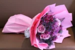 • تغليف فاخر: تأتي الباقة مغلفة بورق وردي ناعم "مات" يبرز لون الزهور، مع لمسة نهائية من شريط ساتان أبيض يضفي طابعاً كلاسيكياً أنيقاً.