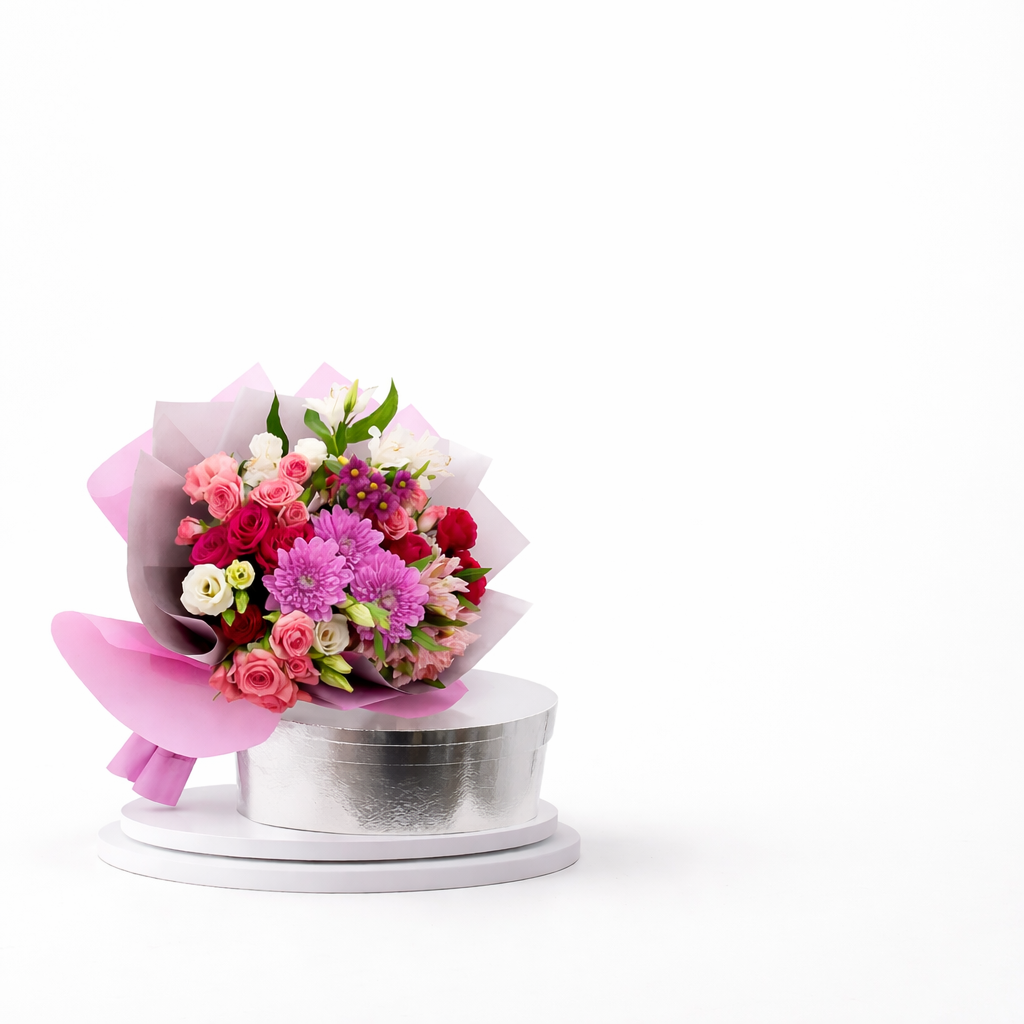 عبّر عن مشاعرك العميقة مع باقة ورد متنوعة تضم الورد الأحمر والوردي والأقحوان. تكتمل الهدية الرائعة مع كيكة أني داني الشهية. هدية مثالية للمناسبات الرومانسية