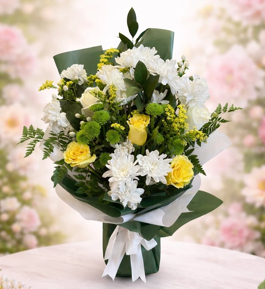 • توليفة ألوان ساحرة: مزيج متناغم من الروز الأصفر الفاخر والأقحوان الأبيض الناصع مع لمسات من الأخضر المنعش.