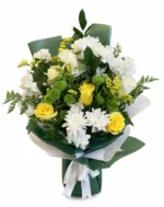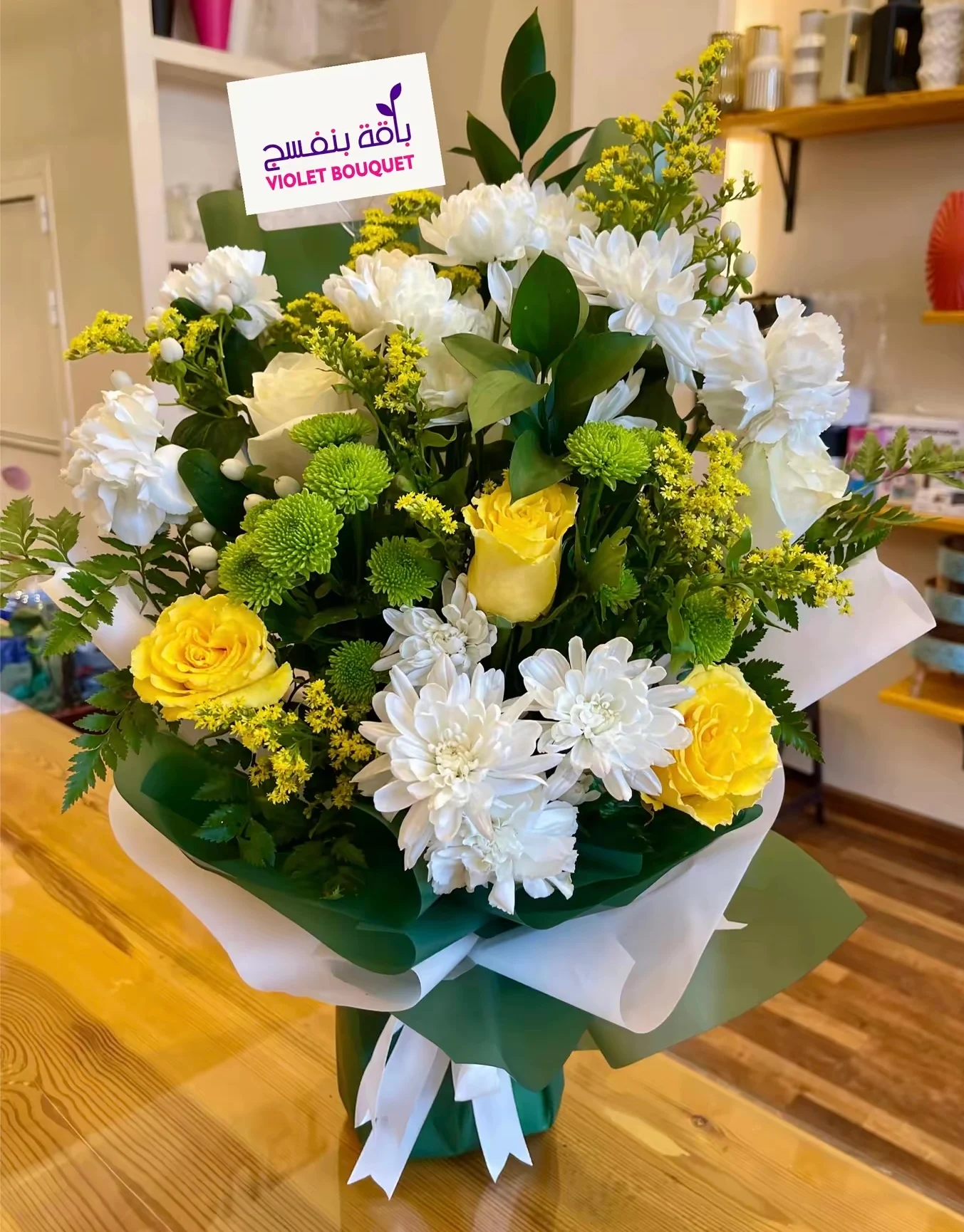 أضف لمسة من الحيوية والجمال إلى يوم من تحب مع تنسيقنا الحصري الذي يجمع بين نقاء الأبيض وحيوية الأصفر. باقة مُصممة بعناية لتكون الخيار الأول للتعبير عن التقدير، الامتنان،