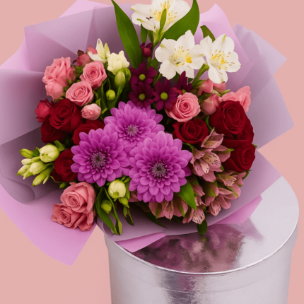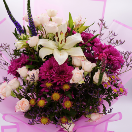 باقة أروقة المحبةعبر عن مشاعرك بأسلوب أنيق وراقي كل ذلك مغلف بورق أسود فاخر مع شريطة وردية أنيقةهذه الباقة هي الهدية المثالية للتعبير عن الحب والمشاعر الصادقة في أي مناسبة خاصة.تتكون الباقة من:* زهور الجوري الحمراء والوردية الرومانسية* زهور الألستروميريا الوردية الجميلة* زهور الكريزانثمم (الكورية) الخضراء والبنفسجية النابضة بالحياة* زهور الفل الأبيض الأنيقة