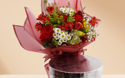 باقة تهاني وحب – بوكيه ورد وقرنفل فاخر بتغليف أبيض أنيق