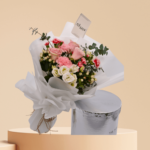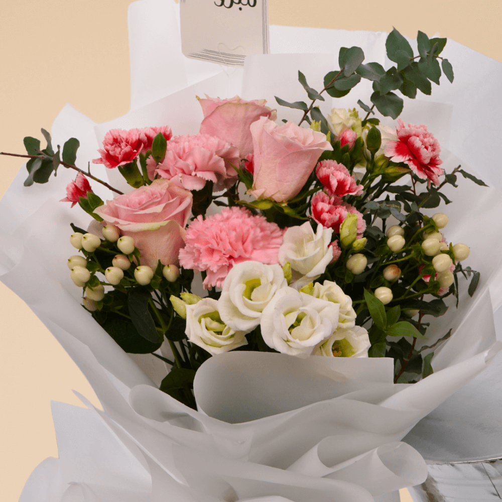 باقة تهاني وحب – بوكيه ورد وقرنفل فاخر بتغليف أبيض أنيق