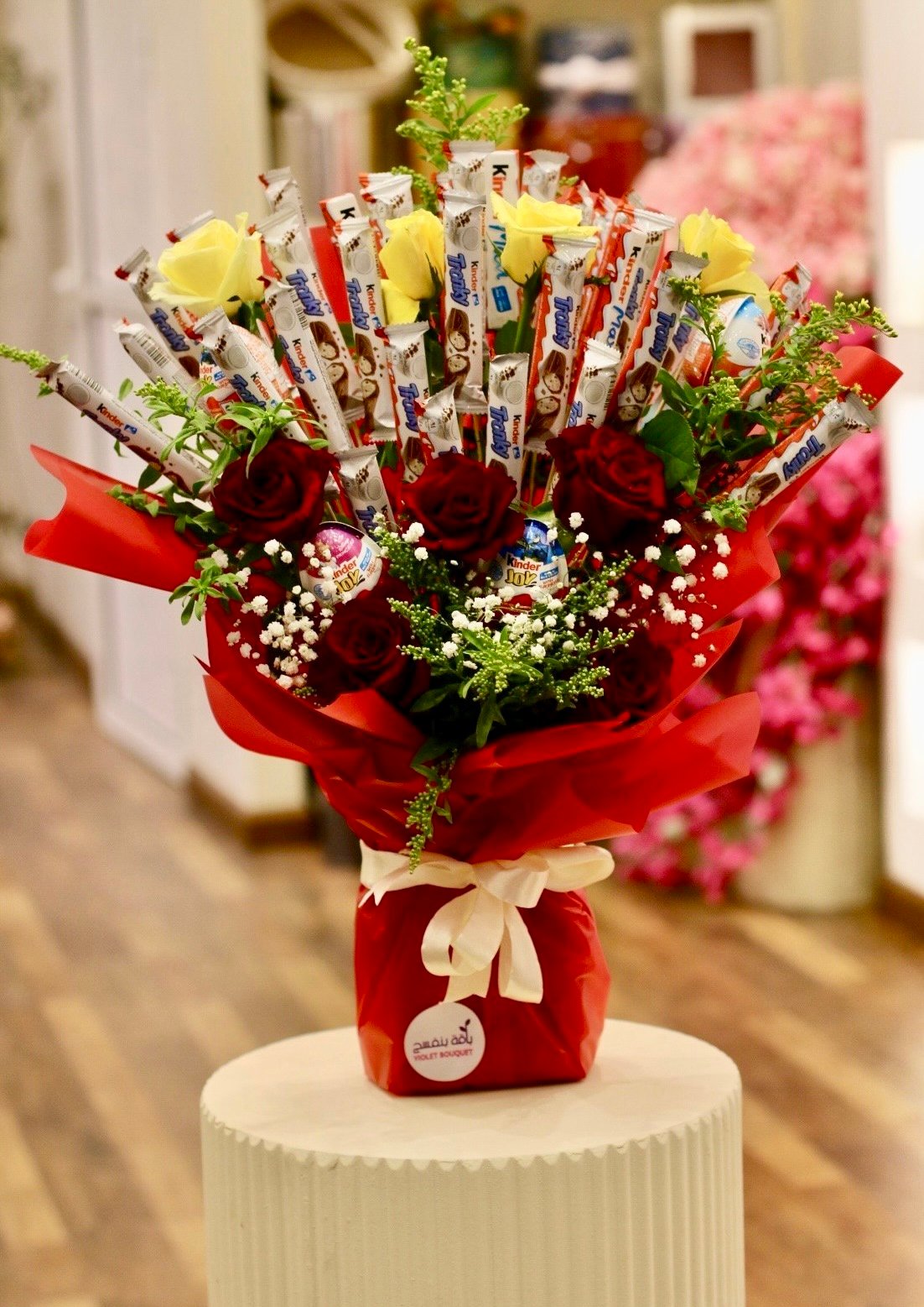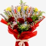 باقة جوري أحمر مع بوكيه شوكولاتة كيندر