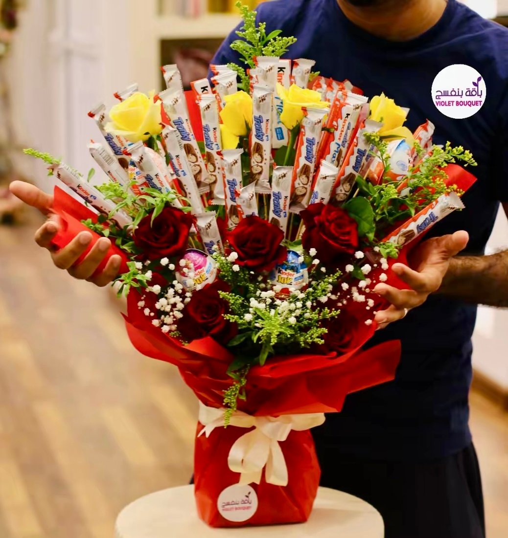 اسعد شخصًا ما بهذه الباقة المرحة! يتميز مزيج من الورود الحمراء والصفراء بشوكولات كيندر (غير متصلة)، مما يوفر مفاجأة رائعة وعلاجًا حلوًا.