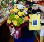 باقة صن شاين – باقة ورد طبيعي برتقالي مع زهور صفراء وبيضاء مع شوكلاتة فيريرو او شوكلاتة أنوش
