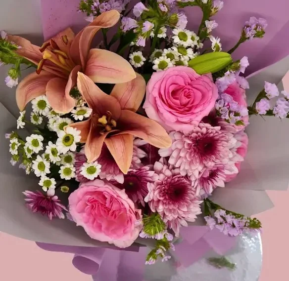 بسمة مشرقة – باقة ورد وردية بلمسات ليمونيوم وليليوم ناعمة