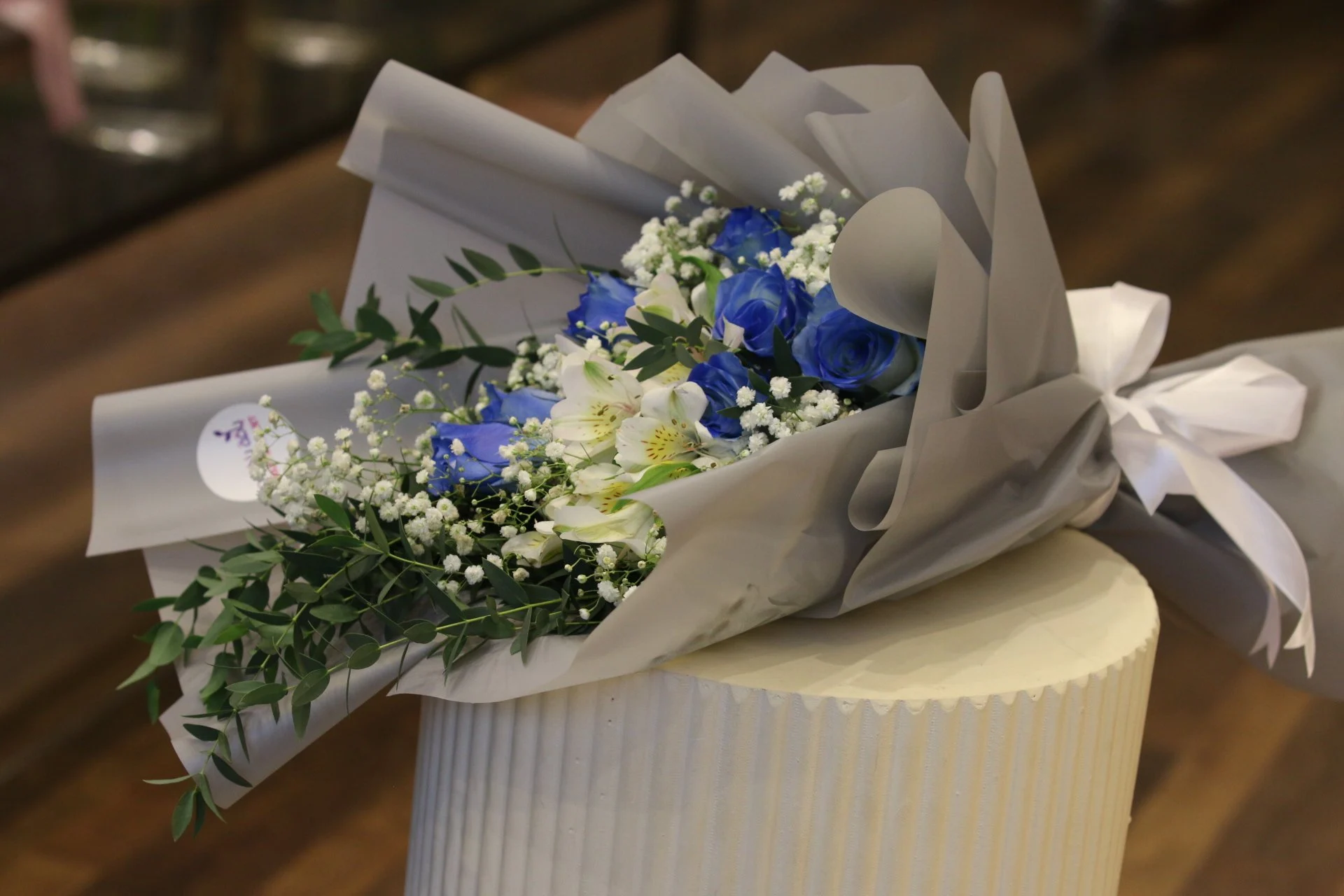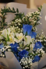 يبرز الغلاف الأبيض جمال الورود والقرنفل والهايبركوم. مع لمسات من أوكالبتوس صغير وإستوما وركوس لإضفاء مظهر ساحر.3 سيقان أوكالبتوس3 ورود2 قرنفل بيبي2 سيقان إستوما4 سيقان ركوس4 حبات هايبركوم2 قرنفل
