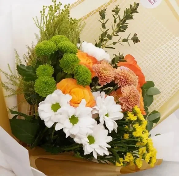 باقة صن شاين – باقة ورد طبيعي برتقالي مع زهور صفراء وبيضاء مع شوكلاتة فيريرو او شوكلاتة أنوش