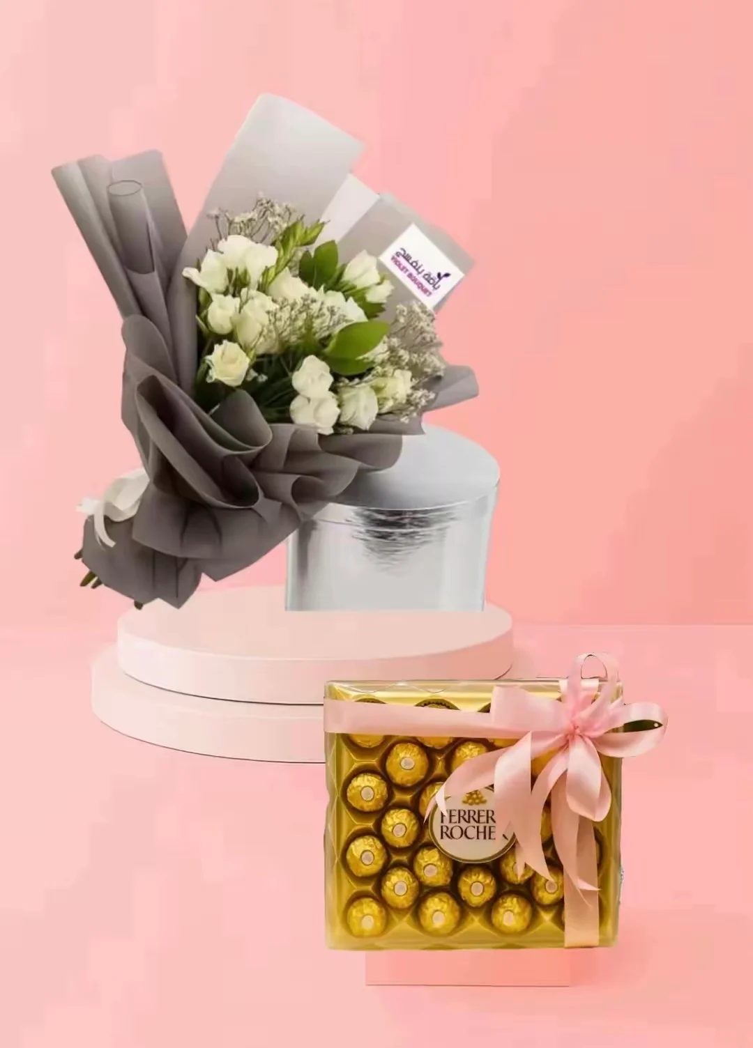 اهدي من تحب هده الباقة الرقيقة من بيبي روز وردية مصحوبة بشوكولاتة فيريرو او باتشي