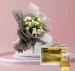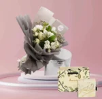 باقة ورود بيضاء آسرة: ترمز للنقاء، الصفاء، والبدايات الجديدة، مصممة بعناية فائقة لتليق بكل مناسبة صندوق فيريرو روشيه الفاخر: اللمسة الذهبية لحلاوة او شوكلاتة باتشي لا تُنسى، لتدلل حواس من تحب بمذاق الشوكولاتة الغني او البستاني بحليب او أنوش الفاخرة