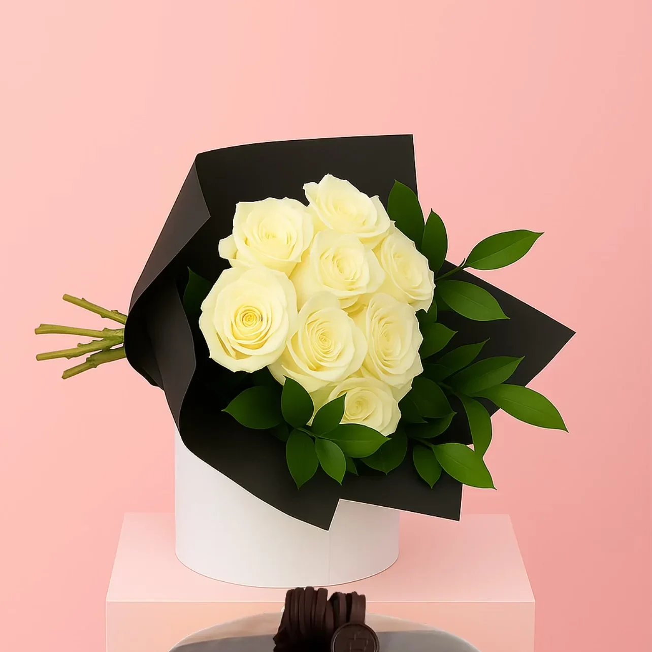 باقة ورد ابيض صغير – أناقة نقية مع 8 ورود بيضاء مع كيكة اني داني الصغيرة