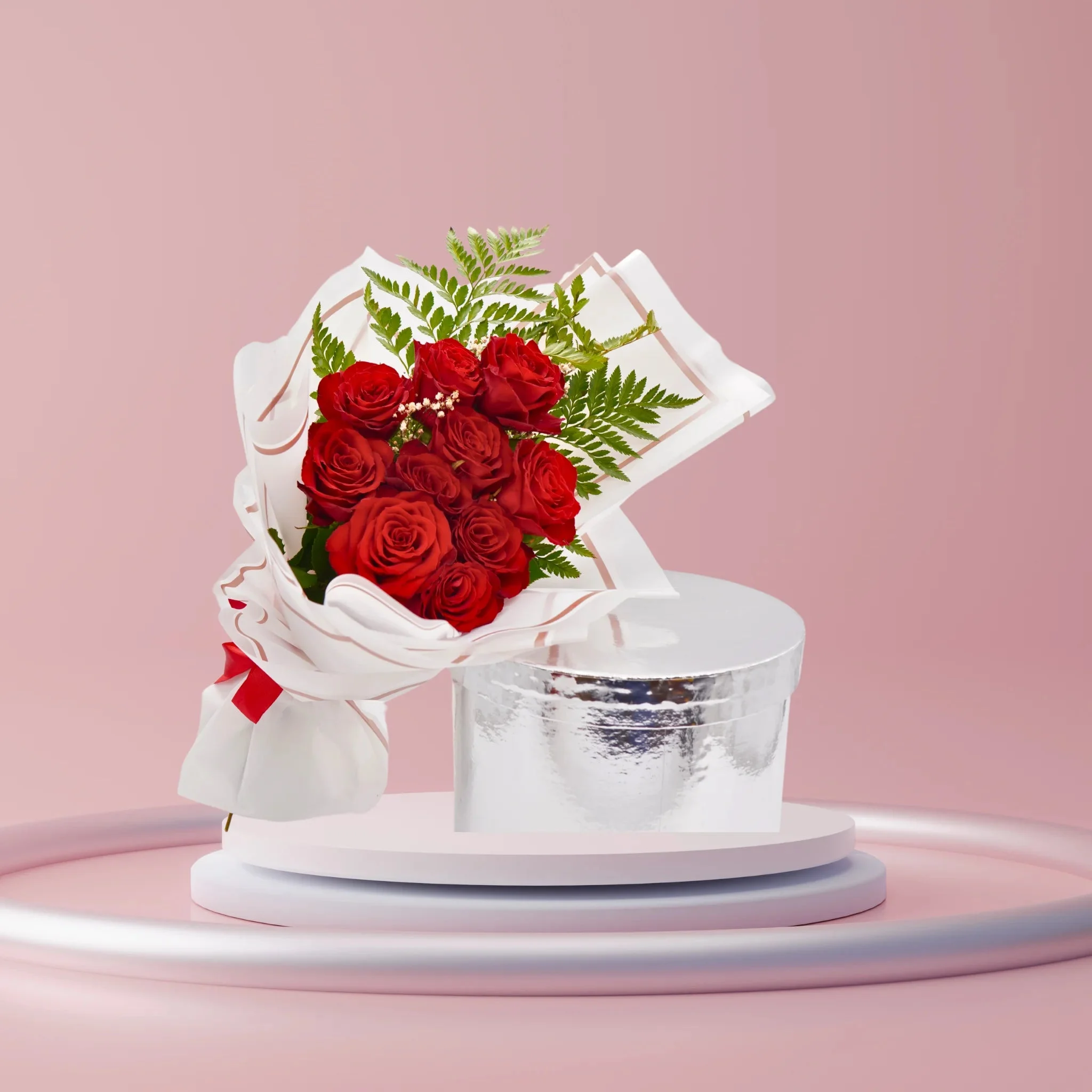 باقة ورد حمراء فاخرة – 10 وردات بتغليف أبيض أنيق مع كيك اروى الصغيرة