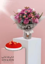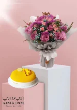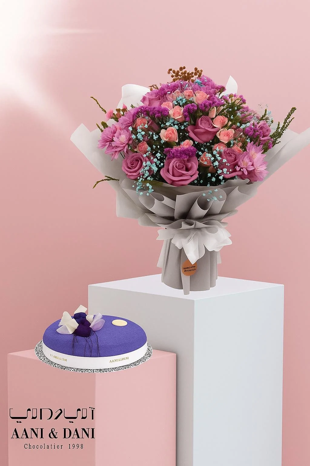 اصنع انطباعًا رائعًا مع هذه المجموعة الهدية الفاخرة. باقة مذهلة مليئة بالورود البنفسجية النابضة بالحياة والورود الوردية الناعمة تخلق قطعة مركزية مذهلة. مقترنة بكيكة اني داني اللذيذة حسب اختيارك، إنها الطريقة المثالية للاحتفال بمناسبة مهمة أو ببساطة لترك انطباع دائم