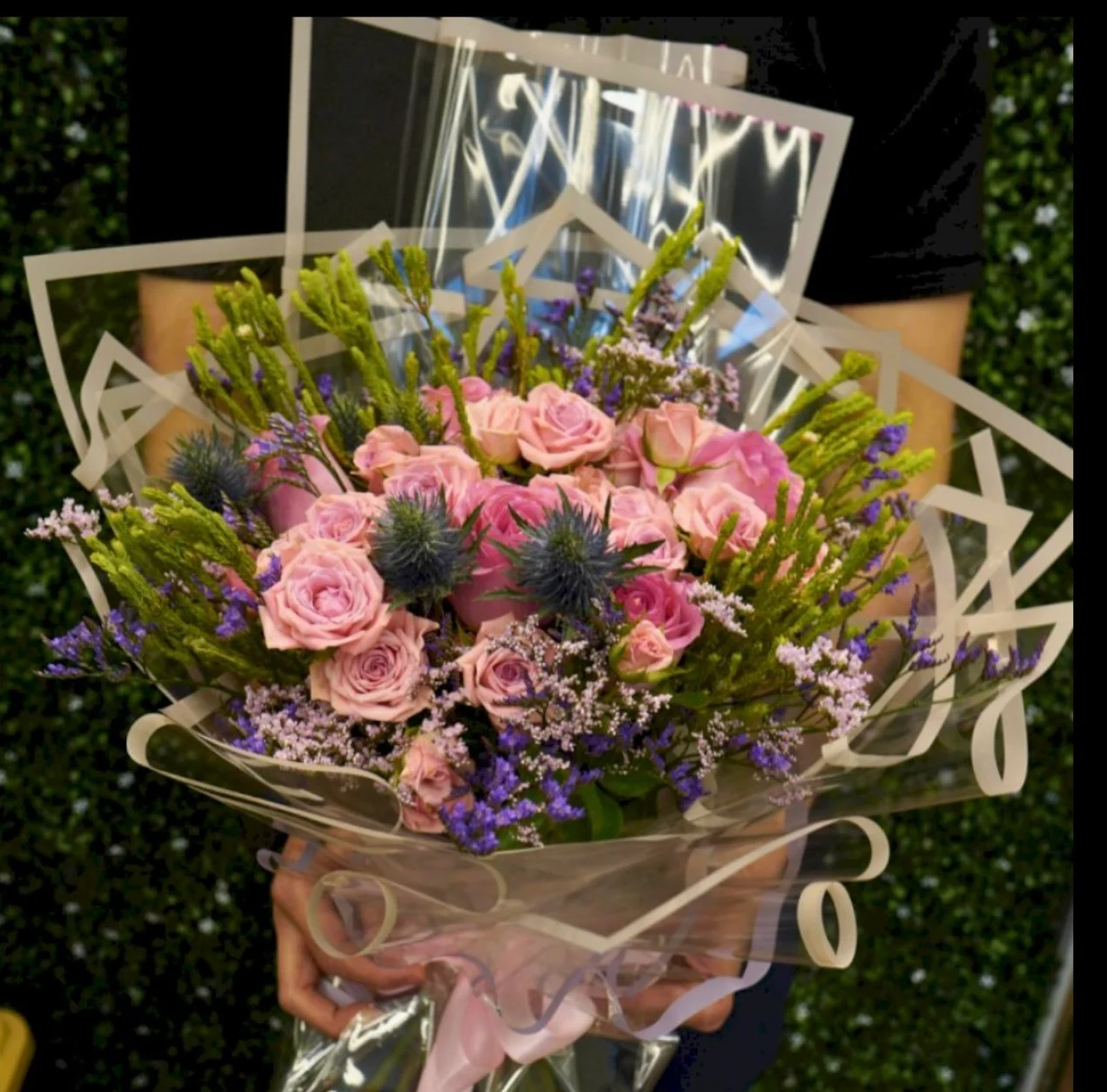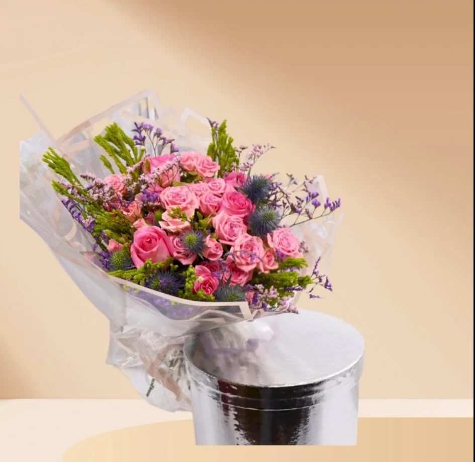 تجمع هذه الباقة الرائعة بين الأنسجة الناعمة والألوان النابضة بالحياة. تتشابك ورود بيبي وردية ناعمة والليمونيوم مع ورود وردية كلاسيكية. مع لمسات من صوليداجو المشمسة وحشوات خضراء ناعمة، تخلق عرضًا ساحرًا ومبهجًا.د