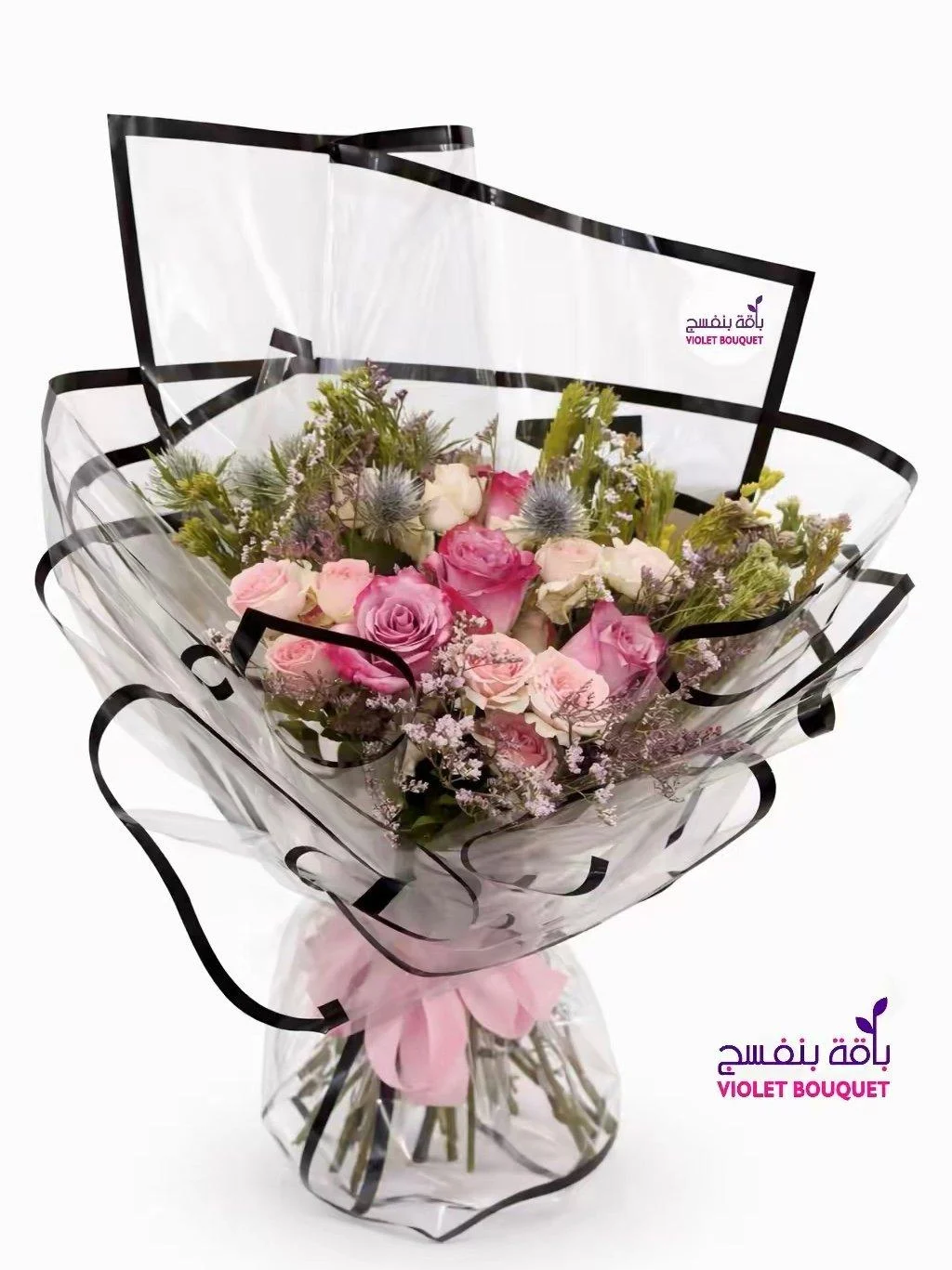 تجمع هذه الباقة الرائعة بين الأنسجة الناعمة والألوان النابضة بالحياة. تتشابك ورود بيبي وردية ناعمة والليمونيوم مع ورود وردية كلاسيكية. مع لمسات من صوليداجو المشمسة وحشوات خضراء ناعمة، تخلق عرضًا ساحرًا ومبهجًا