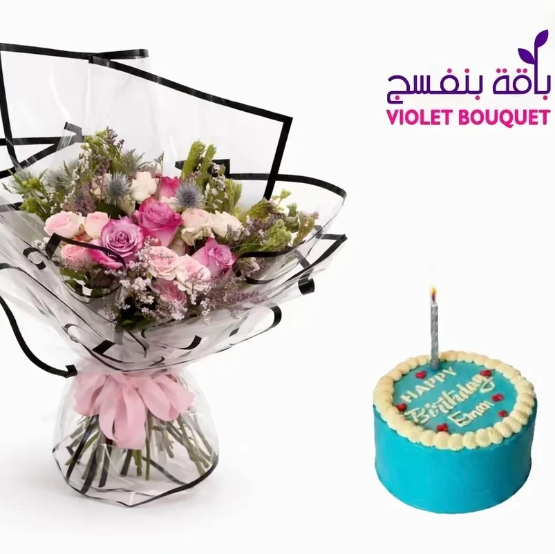 باقة ورود وردية – بوكيه ورد ناعم وملون للهدايا المبهجة مع كيكة اروى