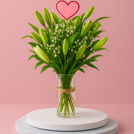 قدم لمن تحب باقة زنابق بيضاء أنيقة، رمزًا للنقاء والجمال. هذه الباقة مصممة خصيصًا لتكون الهدية المثالية لأيام الحب والمناسبات الرومانسية.