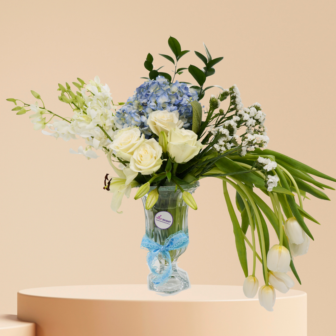• شكل فني: تأتي الباقة في فازة بيضاء أنيقة بتصميم مميز، مما يجعلها قطعة ديكور جميلة لمنزل أو مكتب من تحب.