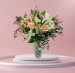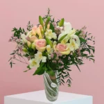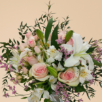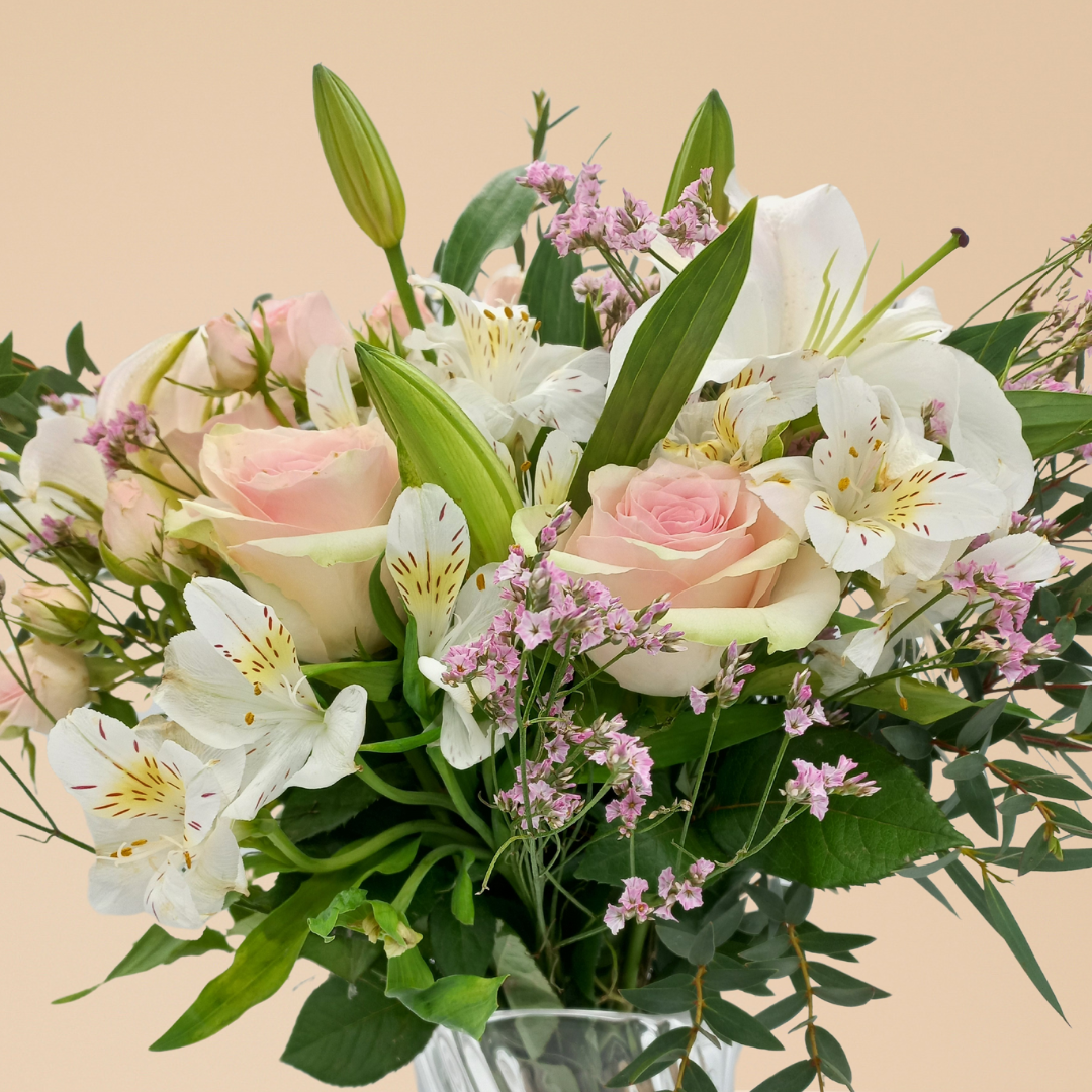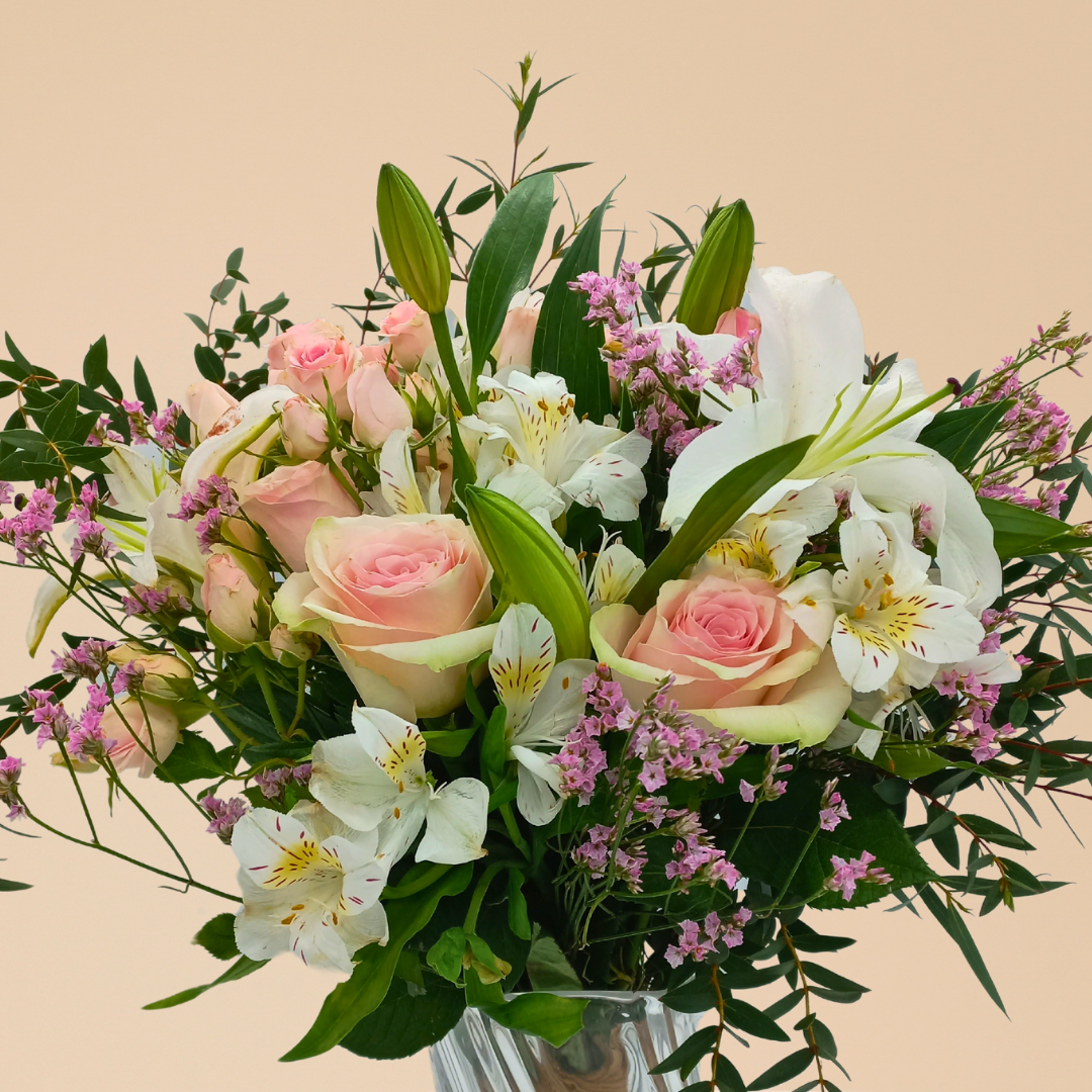عرض ساحر يجمع بين ورود صغيرة رقيقة وإستوما مع ورود كلاسيكية ولمسة من الليمونيوم.