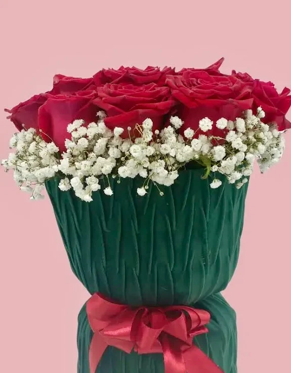 تحفة رومانسية – باقة ورد أحمر أنيقة مع زهور بيضاء