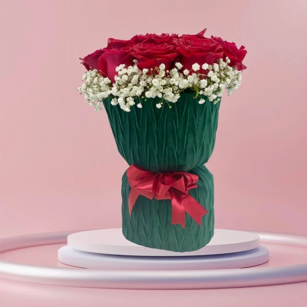 باقة ورود حمراء أنيقة مزينة بلمسات من الزهور البيضاء، مغلفة بخامة فاخرة مع شريط حريري.