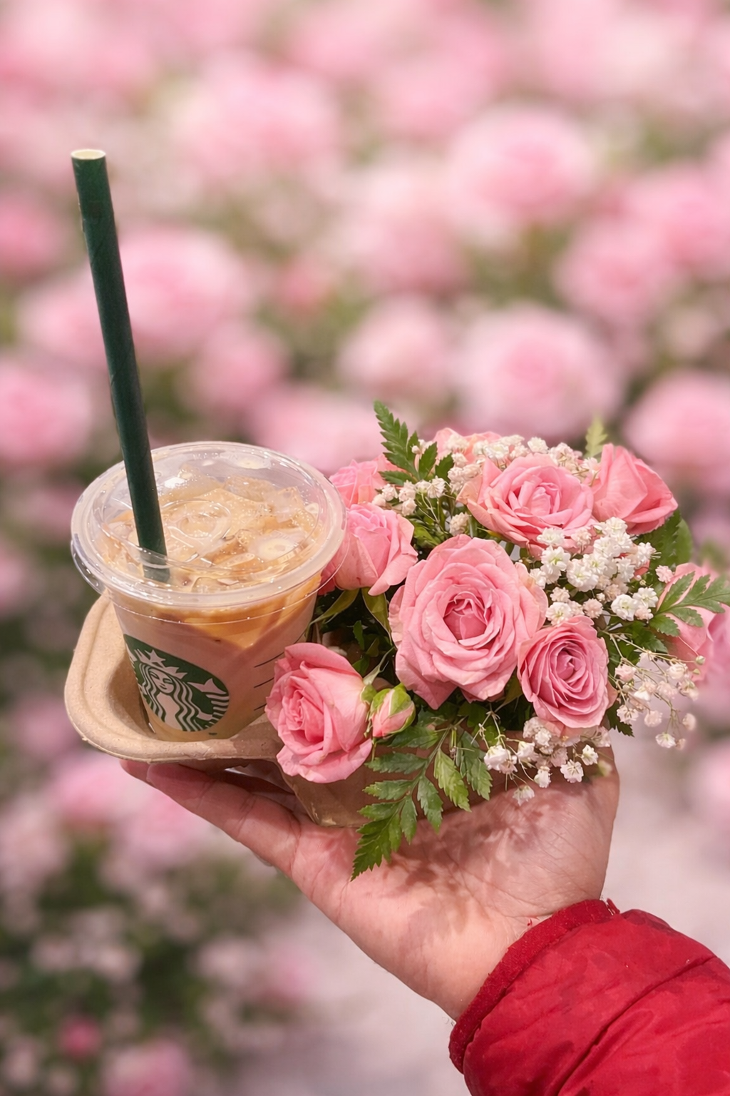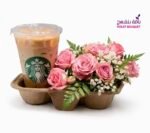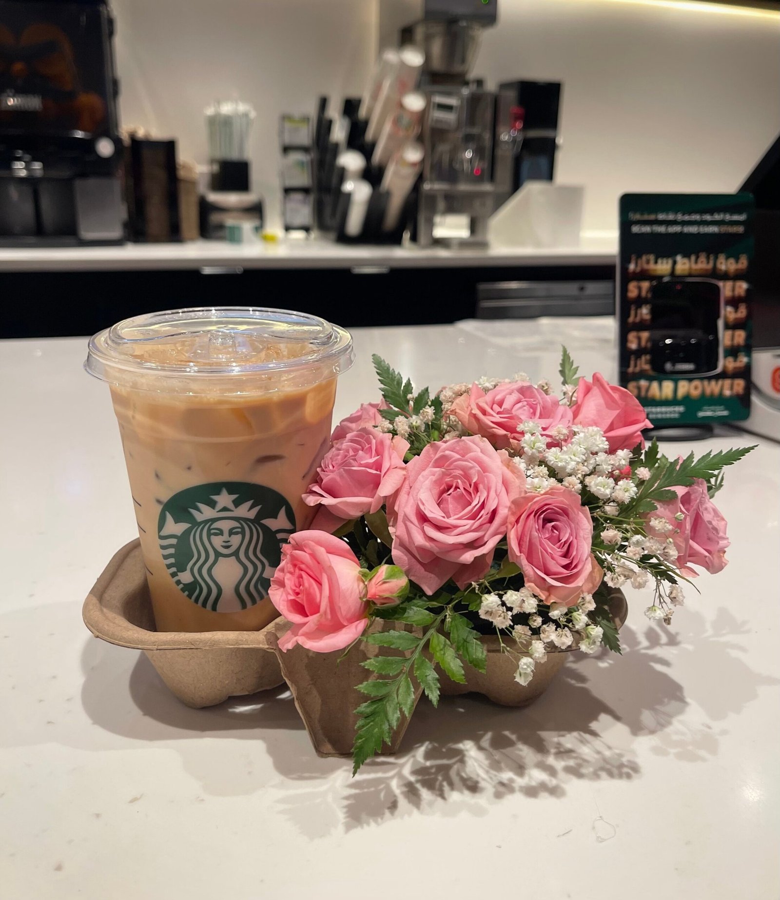 تنسيق ورد وقهوة ستاربكس في حامل أكواب