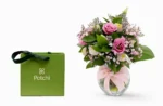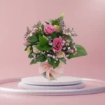 • تناغم الألوان: باقة من الورد الوردي الناعم (Eustoma) مع لمسات من الجبسوفيليا البيضاء، منسقة في فازة زجاجية كروية مزينة بشريط ساتان أنيق.